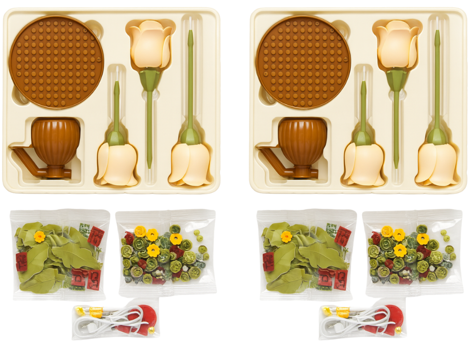 3 adet eklemli gül, 1 adet sulama kabı, 255 adet montaj parçası,